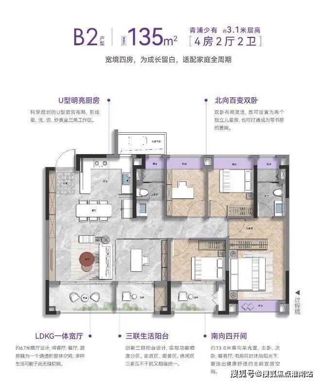 比如次卧与客厅之间采用非承重墙,方便业主自行改造,还可以自定义空间功能划分出儿童学习区、男主人工作室等等,空间可塑性拉满。