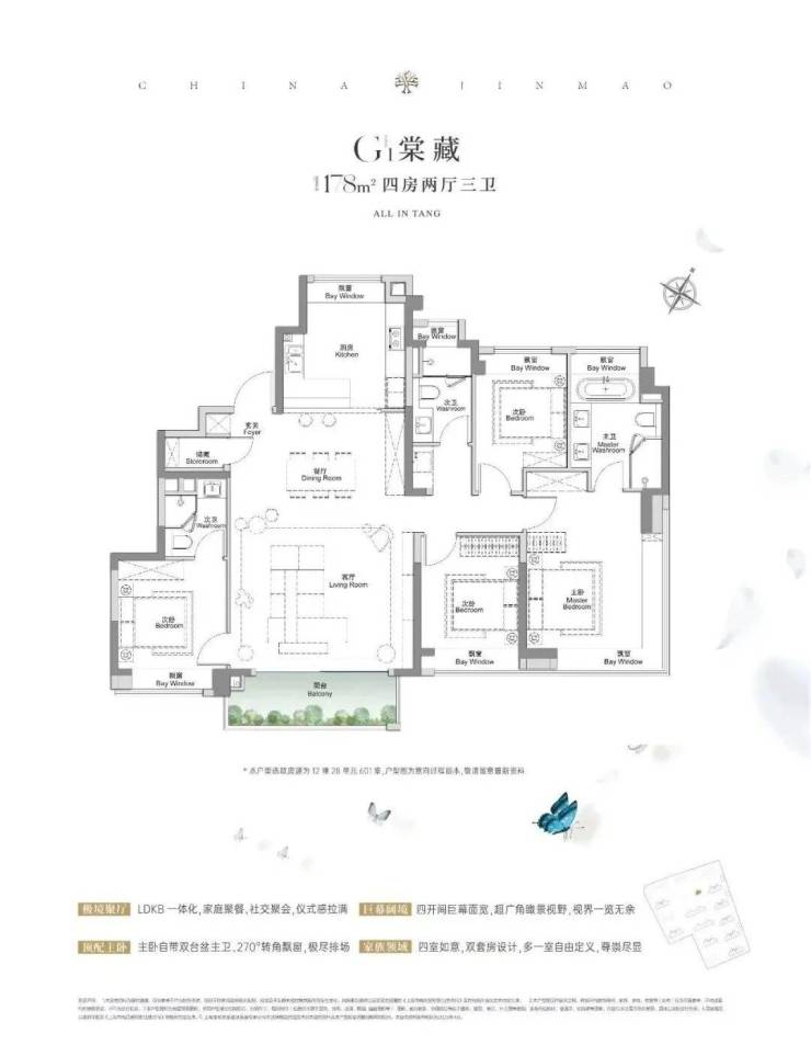 建面约117㎡3房2厅2卫,做到了3+1开间朝南+5个飘窗+主卧套房设计+270°转角飘窗,所有的尺度都有进一步提升。