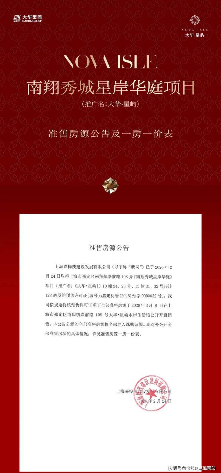 最新公示:嘉定南翔低密水岸墅区「大华星屿」二批次2月26日认购,建面约107-123㎡3-4房,过会均价55529元/㎡!