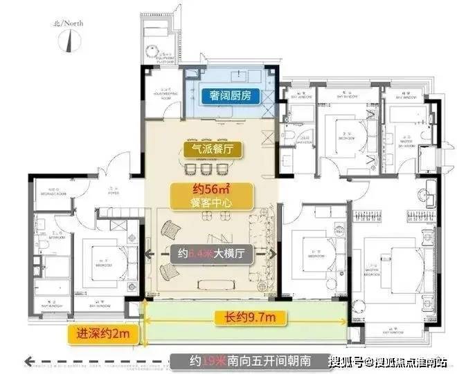 约19米纯粹瞰景面+近约10米的IMAX级超级阳台+约56m²餐客厅空间+约3.15m层高,做出别墅才有的立体复合空间,打开名流专属的城市领空。
