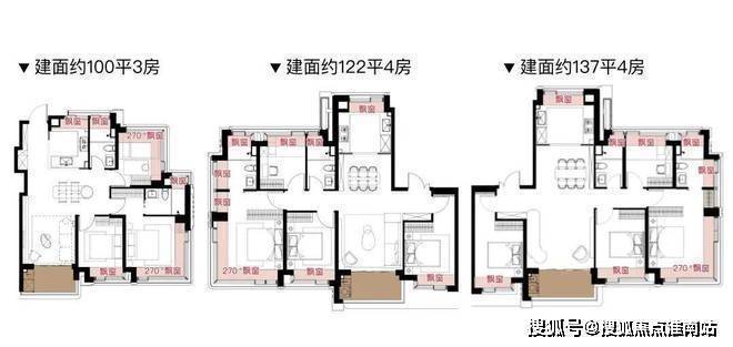 每个户型至少6个飘窗,边套更是约270°转角瞰景。