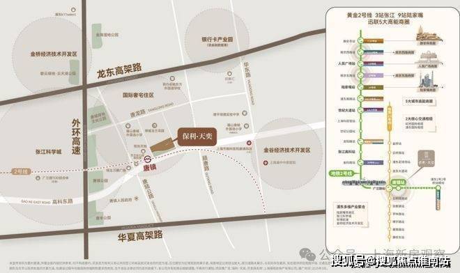 交通方面,该地块算是唐镇地铁上盖项目,与2号线唐镇站直线距离约200米,南侧紧贴着高科东路。通过2号线,2站金科路站,3站张江高科站,9站陆家嘴。