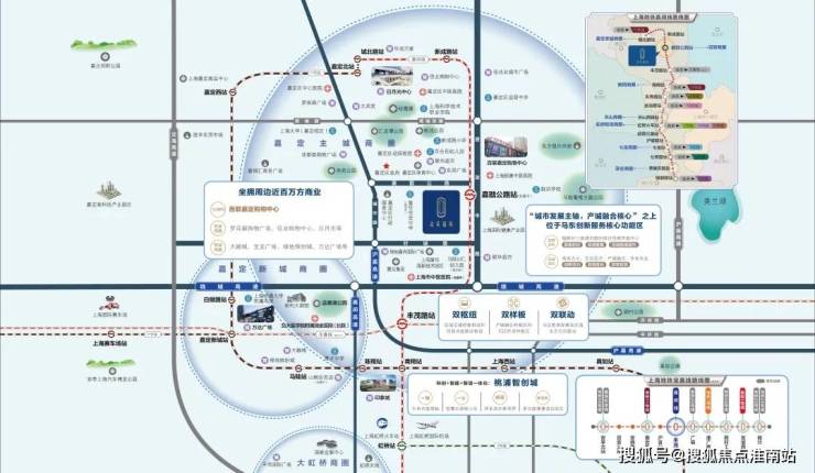 距众禾嘉苑仅一站的 丰茂路站,即为一主二辅枢纽体系中的嘉定东枢纽,是嘉闵线、宝嘉线的换乘站,可 为新城提供直达苏锡常的大容量、高可靠公共交通服务,是嘉定新城最具潜力的核心引擎。