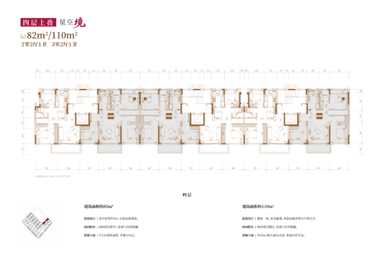 建面约82㎡2房2厅2卫/110㎡3房2厅2卫(四层上叠):