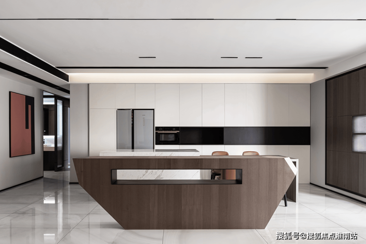 设计师将厨房拆分为中西厨,西厨运用了岛台和餐桌一体化的设计,白色岩板的岛台、胡桃木餐桌配以皮质餐椅,不同材质之间的碰撞迸发出更具美感的火花。