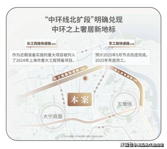 地铁18号线横向拉通了原本纵向不相连的四线地铁:1/3/18/19,将北上海横向联通,成为区域轨交的交汇聚点;项目紧邻长江西路地铁站(直线距离约150米),1站江杨南路,5站复旦,7站五角场。中环线北扩段明确兑现,军工路快速路25年开工,长江西路快速路列入上海市重大工程清单预备项目,快速链通城心,随着中环线北扩段的政策明确,淞南将正式进入中环时间。未来经逸仙高架,进入南北高架、内环高架、中环高架,可快速链通南北上海;