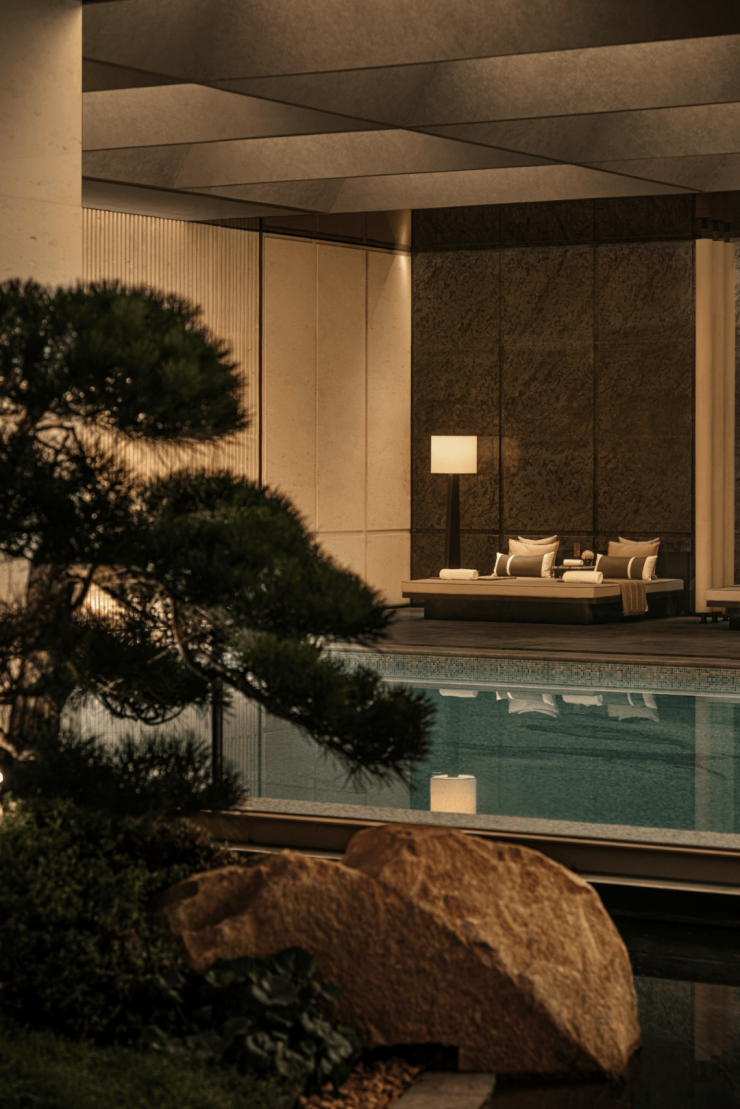 林木掩映的「松涧天光」恒温泳池,约30-32℃四季恒享,纵身跃入约8米x20米的碧波,亦或于池畔躺椅小憩,看天光云影共舞,在自然诗意中躺平。