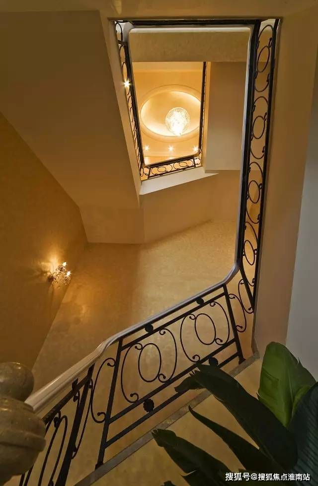 楼梯采用顺时针螺旋设计,寓意顺气,暗含财运事业平步青云,楼梯顶部为屋顶挑高艺术穹顶,可悬挂大型吊灯,气派华丽。