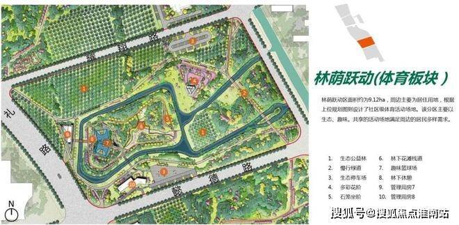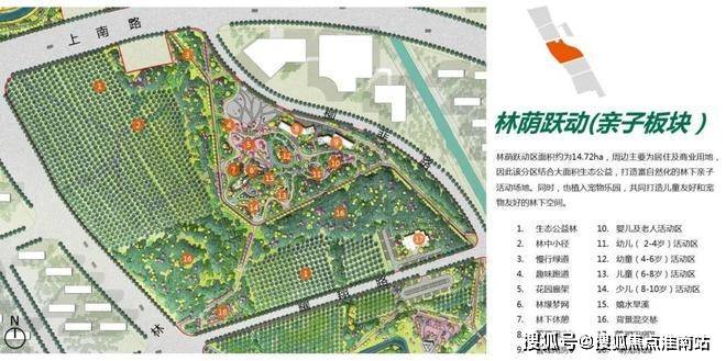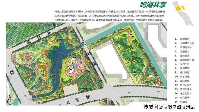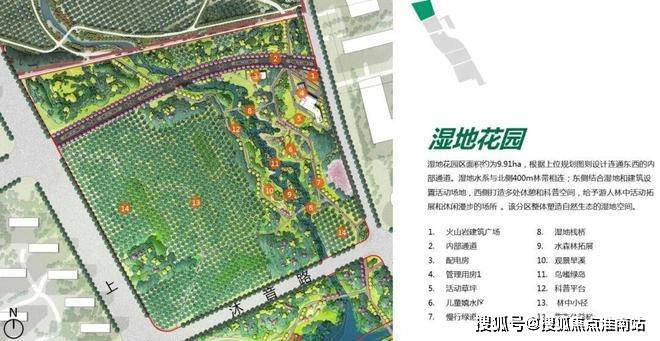 整座公园(在建中)划分为:湿地花园区、鸣湖共享区、林荫跃动区和社邻园艺区,四大功能分区。