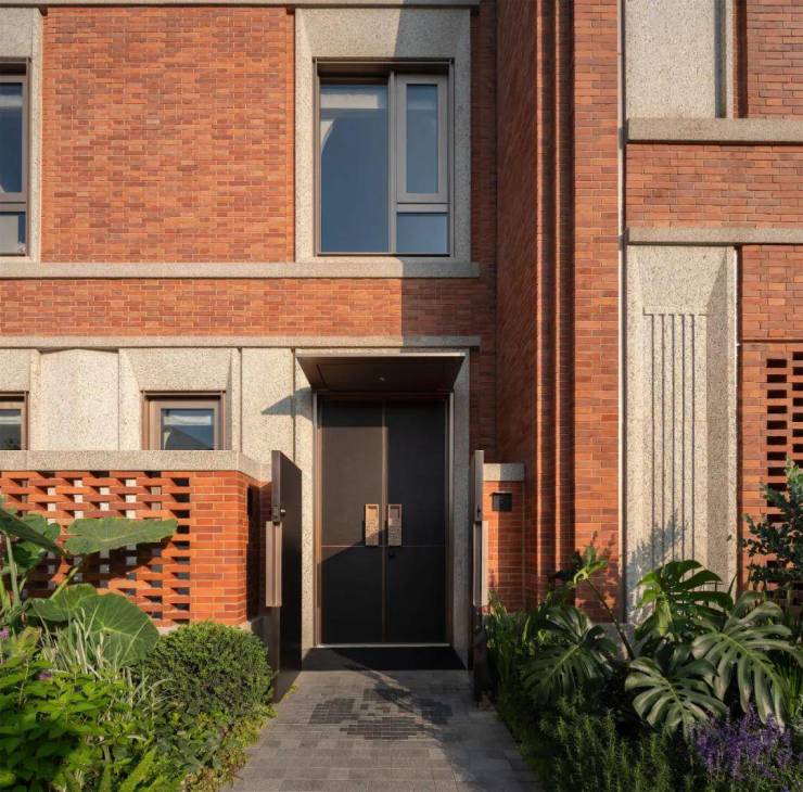 每一处细节都可以看出翠湖滨江的极尽用心——精巧的红砖镂空景墙、房檐上隐约可见的山茶花雕花、极具海派韵味的石库门、石材斜切面的窗套。