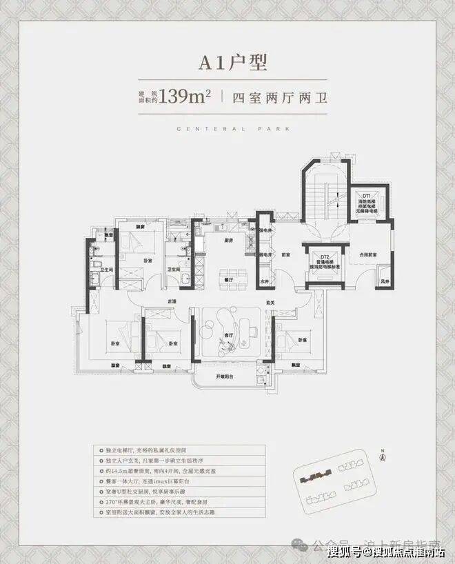 中环铂樾建面约139㎡的户型(西边套),独立电梯厅+罕见的大横厅设计,大面宽短进深,约15.05m的南向奢阔面宽,无论是采光感、尺度性都拉到了极致,享受城央豪宅级别的采光。
