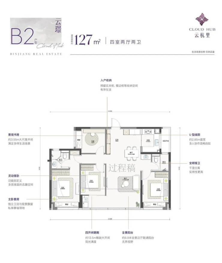 建面约139方4房2厅2卫边套,实得率约91%,布局“优秀”。全封闭式阳台,三面采光,观景视野无敌。