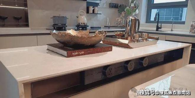 厨房额外标配带有收纳柜体的岛台空间,轨道式插座同样是交付标准,招商时代乐章售楼处预约热线☎:VIPLINE√√√厨房台面是和内环某10万+项目同款材料: