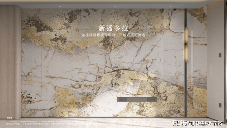 充分考虑业主的个性化需求,在电视背景板提供了新潘多拉、云中翡翠、弗朗明戈金三种结晶釉面岩板选择,成本更高,施工难度也更大。