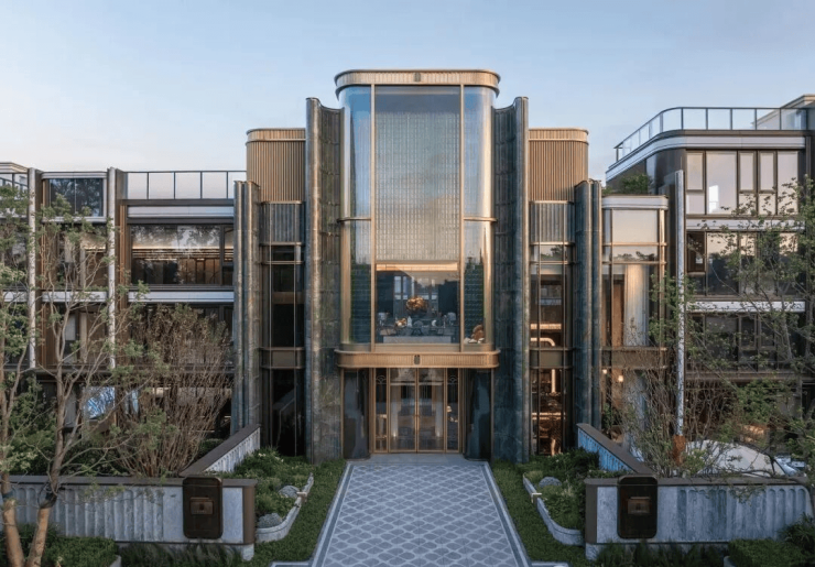 尤其是项目的建筑立面:巴西进口亚马逊绿奢石、弧角玻璃和铝板,这样颠覆性的组合在外环别墅项目中,可以说是非常少见的存在!