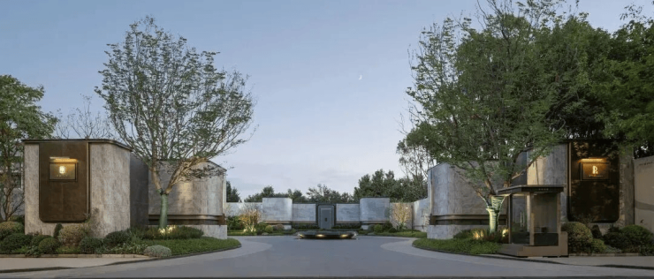 约100米长的私家礼道,两侧4米高景墙庄严夹道,整整齐齐的香樟树撑起"绿色的华盖"