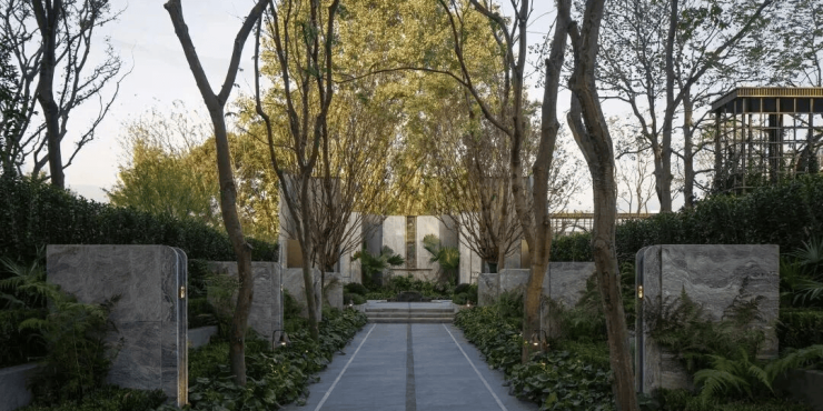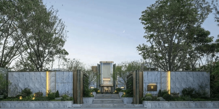 借鉴思南公馆经典的三重归家礼序,项目巧妙利用原始地形打造拥有约2米高差的归家台地,特别设计"三升九阶"的三段式台阶,寓意"步步登高、层层递进、终臻圆满"