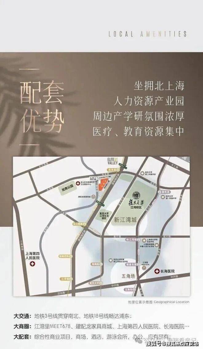 周边配套成熟:紧邻复旦大学江湾校区(约500米)、400-902-3966五角场商圈,3公里内有宝山万达、悠方购物中心;医疗资源涵盖上海市第十人民医院、长海医院;交通便捷,除地铁3号线外,自驾可通过中环线快速通达虹口足球场、陆家嘴等地 。