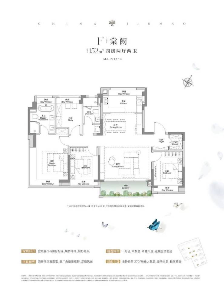 建面约137–178㎡四房两厅两卫:大面宽阳台 + 主卧套房,定位改善家庭