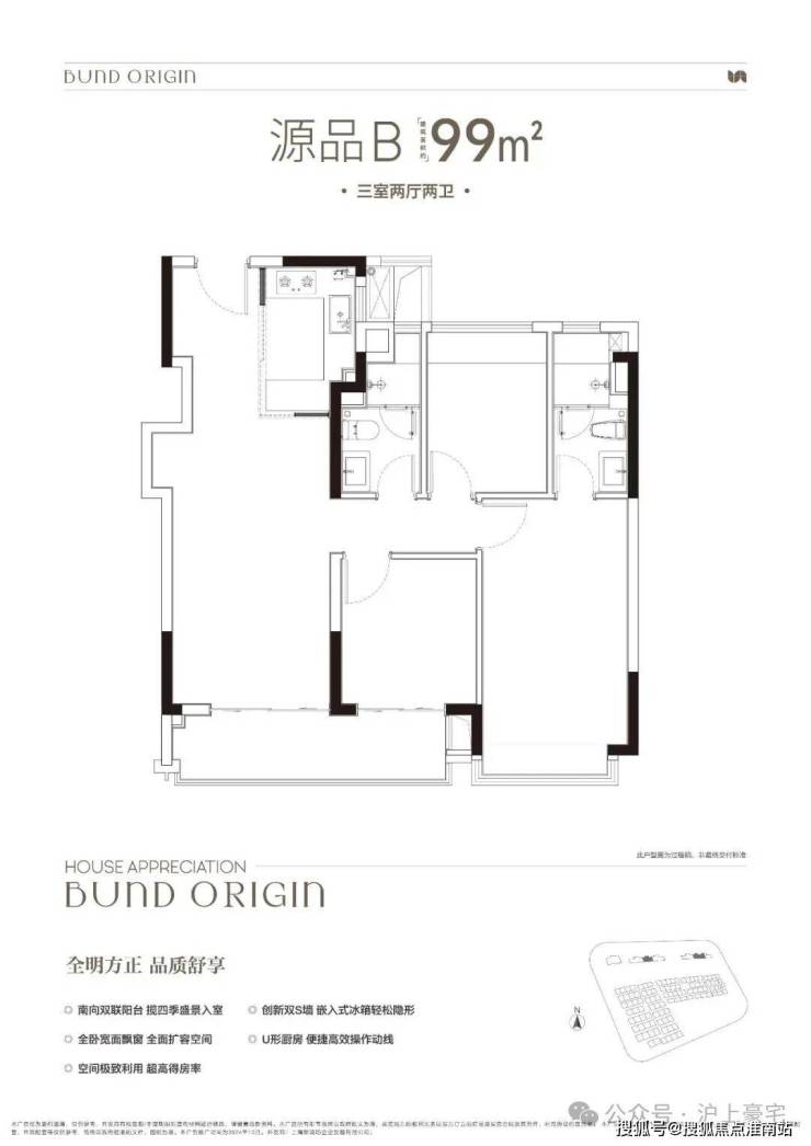 建面约99㎡3房2厅2卫,非常标准的动静分离、三开间朝南户型。