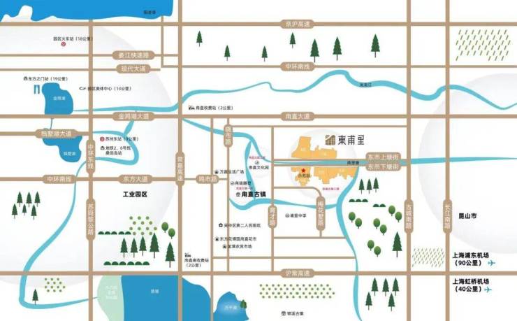 北枕吴淞江,南揽澄湖胜景,西接苏州工业园区(车程15分钟),东望昆山南港。距上海虹桥国际机场40公里,苏州地标东方之门18公里,双高速口环伺(甪直南/甪直出口2公里)