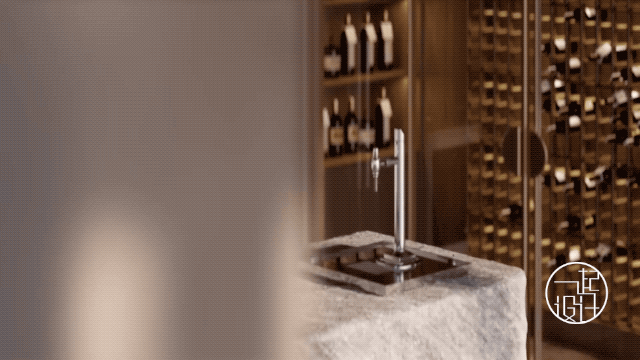 红酒室选用了更省空间的推拉门,内部的墙面与天花均贴设高档的深棕色木饰面,显露一丝奢华气息。