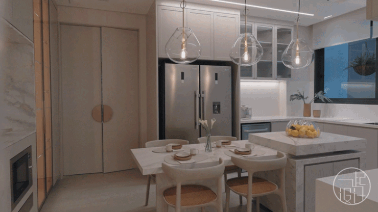 餐桌对面的白色双开门后方还加设一间独立的家庭式餐桌厨房,打开门后与阳台景色保持视线连通。