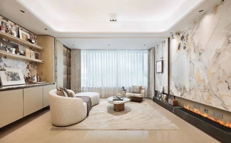 其二,含“奢石量”超高,审美质感在线。客厅地板选用土耳其进口石材,主卫台面为云顶白石材,玄关台面采用雪山银狐奢石。