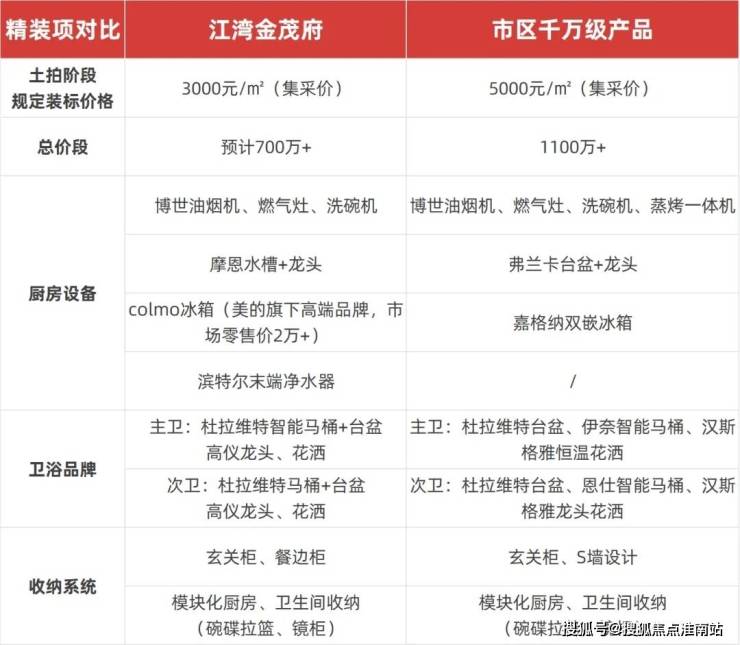 更贴心的是主卫美妆冰箱、“一镜到底”的镜柜、壁龛、厨房的“轻松抽”、餐边柜......收纳力MAX!不多拽文了,直接上对比,江湾金茂府3000元/㎡的装标实在多了👇