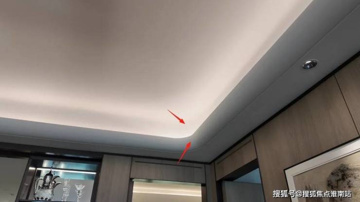 比如弧形元素贯穿整个室内空间,多层吊顶内外都做了弧形转角,相比棱角分明的直角边,弧形的几何感不仅能起到柔化空间的效果,也能祛除心理上的疏离感。