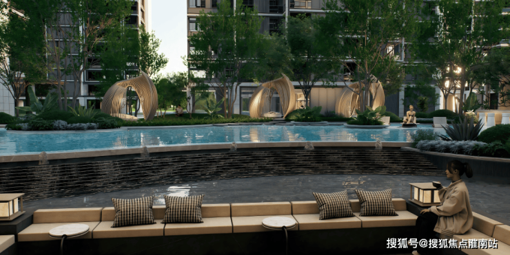 正是绿城首度落地的3.0泳池综合体。这一空间位于社区核心,归家必经之路上,融合中心泳池、林下客厅、卡座与廊架,成为串联生活场景的视觉与功能中心。与立体水院动静相衬,约34米泳池深浅分区,满足孩童嬉戏与成人畅游。池畔一侧为健身区,一侧为书吧,运动挥汗与静心阅读和谐并存,让身心各得其所。