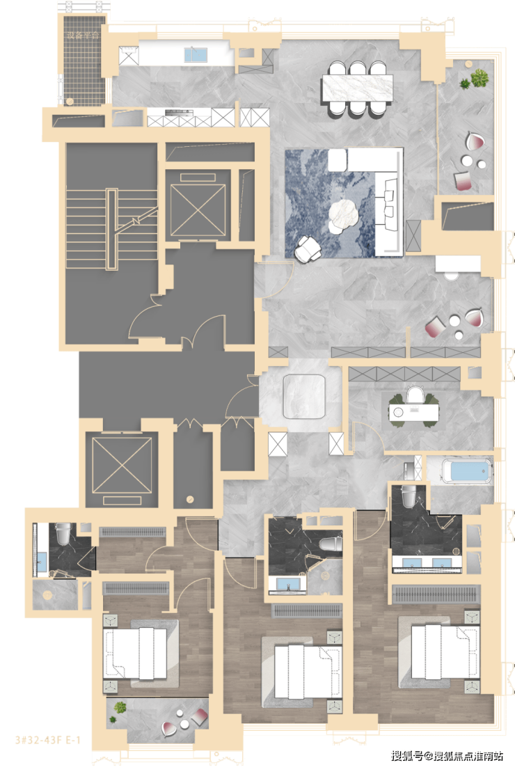 其中3#为超高层,北向可观小区绿化和苏河景观,高区可瞰三件套盛景。