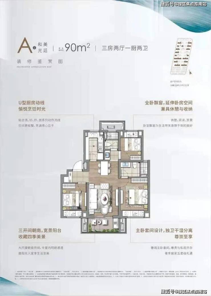 建面约90㎡三房两厅两卫是项目的明星户型,阔绰空间尺度,大三房设计,满足三代同堂及二胎家庭需求。