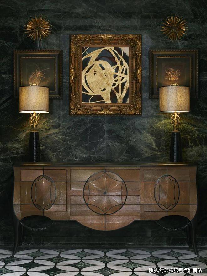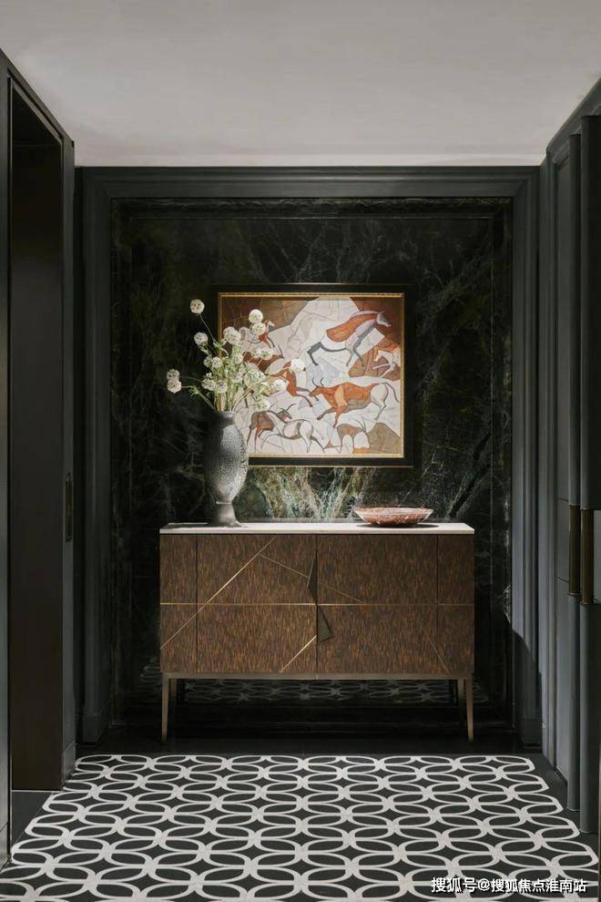 玄关柜选用的是曾经上过佳士得拍卖行的同系列柜体、柜体的材质运用泰国进口稀有珍珠鱼皮密拼,将稀有材料与传统技艺相结合,每条鱼只有鱼背中心一块可以使用,处理后的鱼皮手感特别。