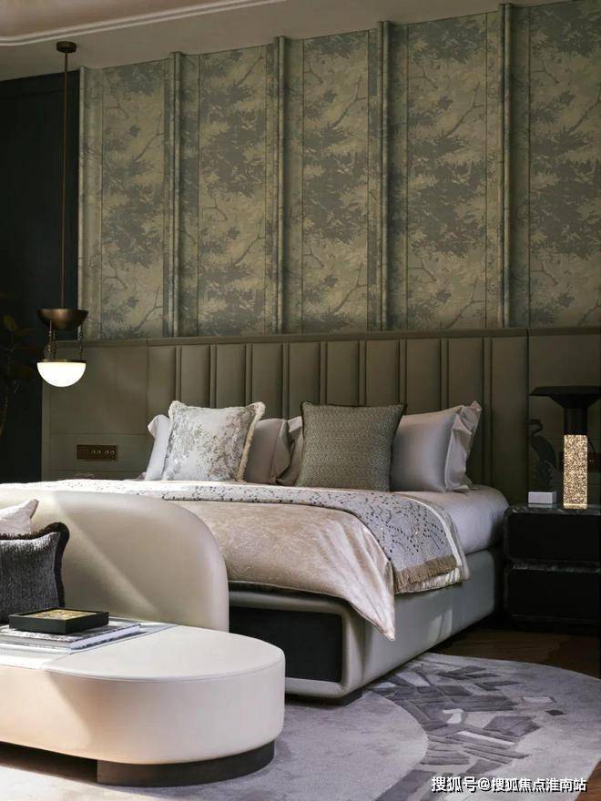 复古拼花地板、古董边柜、印度手绣壁纸,每一寸线条道尽委婉细腻的东方表达。错落有致的金色紫藤透过金丝和贴花的精湛工艺,在羊毛缎面织物上垂落缠绕,自然、温暖、高雅充盈休憩空间。