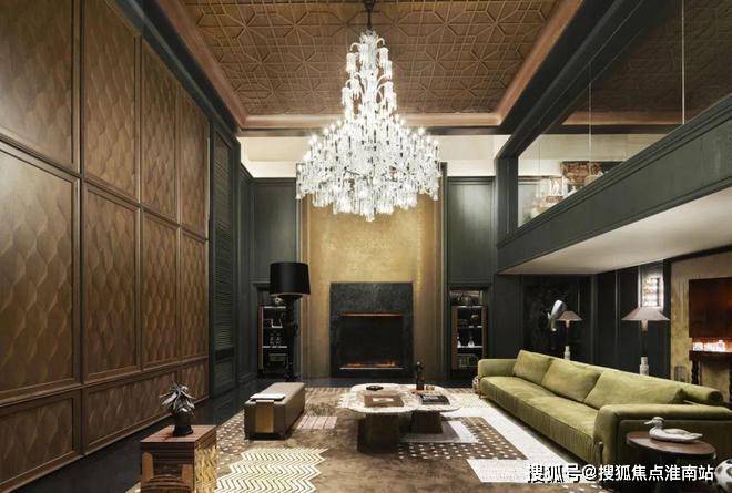 行至地下一层,门前呈现出更加私属隐秘的会客空间,作为地下沙龙的延伸,又是主人家的一方乐活之地。巨大的古典水晶吊灯让光亮倾泻而下,富有装饰主义色彩和雅致情调的会客厅,有宽绰沙发与长案,老友在此相聚交流,促膝畅谈,壁炉里有跃动的火光相迎,大理石桌面仿佛有水景承托,与流动的话题融合共生,泛起阵阵涟漪。