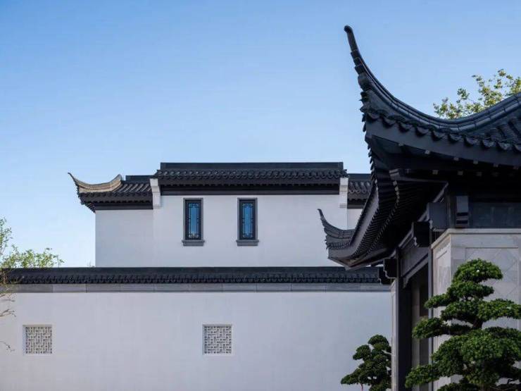 白墙,能大面积反射阳光,让“光与建筑”产生一种明快的互动关系;黑瓦,应对江南夏天高温高热,而黑色恰好能够吸收阳光,起到隔热的效果;飞檐,则是依照南方多雨的气候。雨落在高翘的飞檐上能抛得很远,也就减少了对建筑基础的损害,高低错落,呈现出舒展的韵律之美,结合景观,自然地形成“山水”意向。