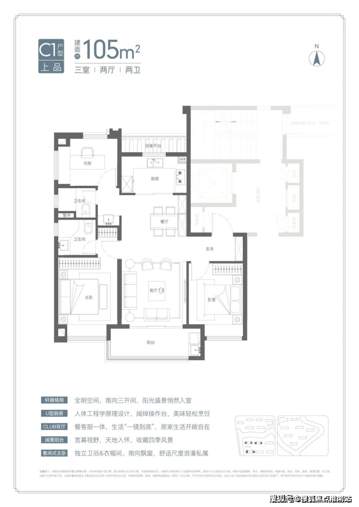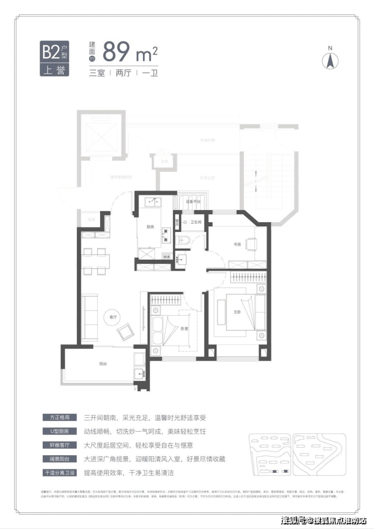 U型厨房、餐厅、客厅、阳台一线联通,南北通透。主卧套房、全卧飘窗、次卫干湿分离也都是标配。