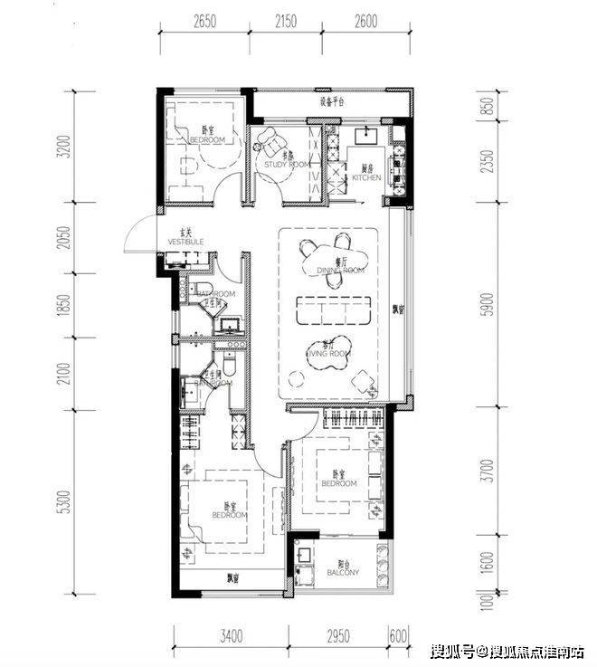98平方米也是三房两厅两卫格局,分为中间套和边套两种。边套户型自带5.8米大横厅,一体化餐客厅设计,带来更加通透舒畅的居住感。