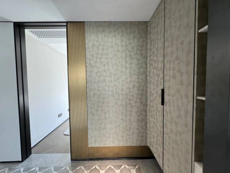 入户门是是非常有质感的铸铝门,带电子猫眼智能门锁;进门后是一个独立玄关,木纹玄关背景墙,右侧是通顶的悬浮玄关柜,内置鞋柜精灵和抽拉鞋架。