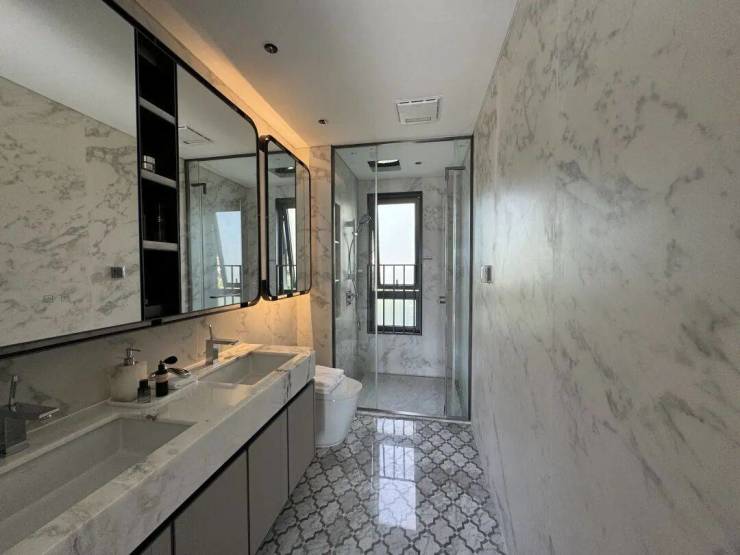 主卧卫生间采用唯宝双人台盆,客卫高仪花洒+龙头+智能马桶。