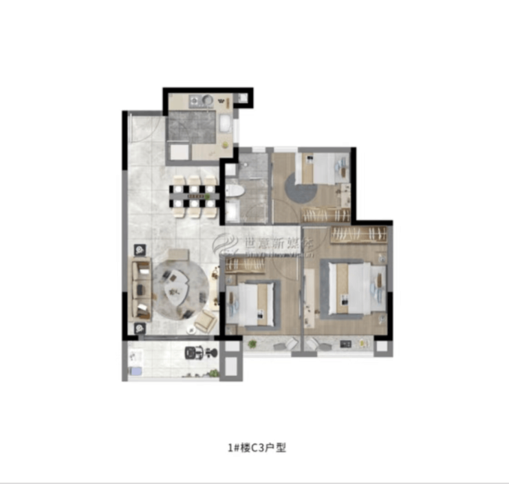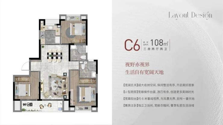 建面约108㎡3房2厅2卫,做到了三开间朝南+双阳台设计+主卧套房设计+南北通透,该户型得房率非常高。