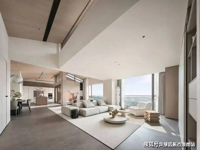 倾斜的吊顶和特意做出的错落 “断层”,增强了空间的纵深感。这种感觉不是来自单一方向,而是四面八方的张力共同形成的。