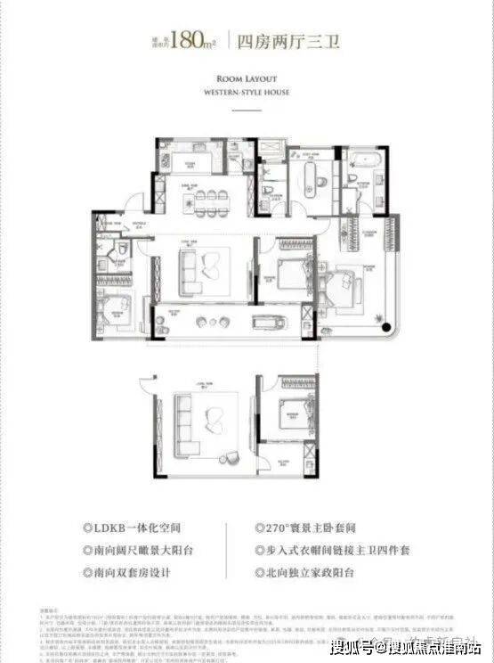 双套房设计,南向三间卧室+主卧行政套房设计,带有270°L型转角飘窗,全景舱视野下,让家宛如拥有两座“空中花园”。