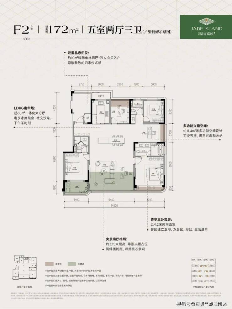 ❷建面约172㎡F2户型,可隔断改造为五房,含赠送得房率约94%。