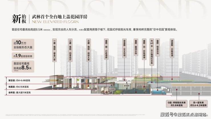 项目为整体抬板设计,抬升高度约4.15米,底部架空层高约4.0-4.4米,即首层住宅架空高度约8米以上。