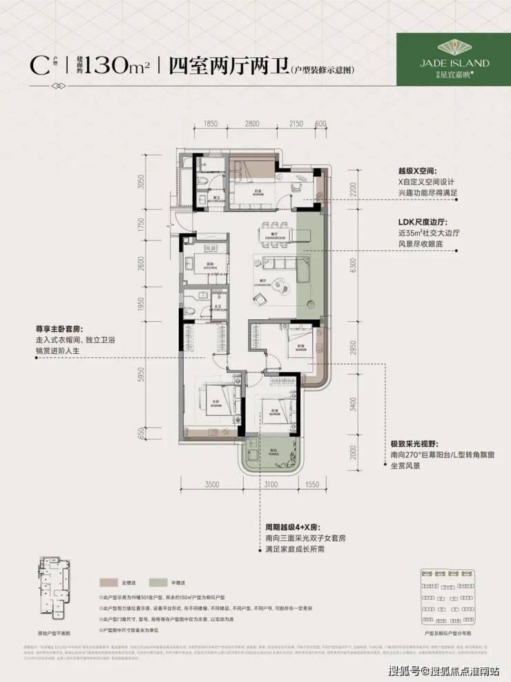 ❹建面约136㎡南厅户型,4房2厅2卫,含赠送得房率约96%。