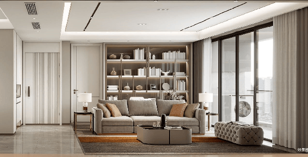 客厅和主卧都标配悬浮吊顶、无主灯设计,背景墙采用皮革和铝合金拼接,也都是实体交付的。