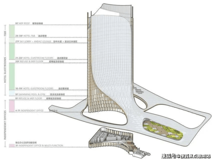 综合体的独特张力借助酒店塔楼立面上标志性的巨型玻璃天幕得以体现,这一设计元素强化了建筑开放姿态的理念。巨型天幕沿着酒店塔楼立面顺流而下,在低区如双翼般展开形成弧面。这个水平弧面向 4 栋塔楼动态环绕后,塑造了各功能之间的链接纽带,并勾勒出内外部庭院的轮廓。