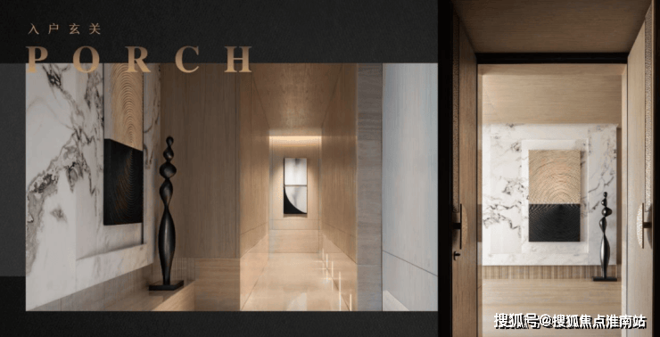 ② 材质与工艺:全屋奢石通铺,选用梅西同款芬迪白石材作为电视背景 墙,搭配超白洞石入户门厅、碧潭金沙高级花岗岩地面等,细节处彰显奢华质感。